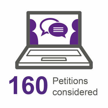 1. Over the course of the Parliamentary year, the Committee considered a total of 160 petitions on a wide range of issues. Of these, 98 were continued petitions (i.e. petitions first considered before the period covered by this annual report) and 62 were new petitions (first considered during the reporting year). Most petitions are considered on a number of occasions. Of those petitions considered by the Committee, 69 were closed. A full list of petitions considered is included in Annexe A.