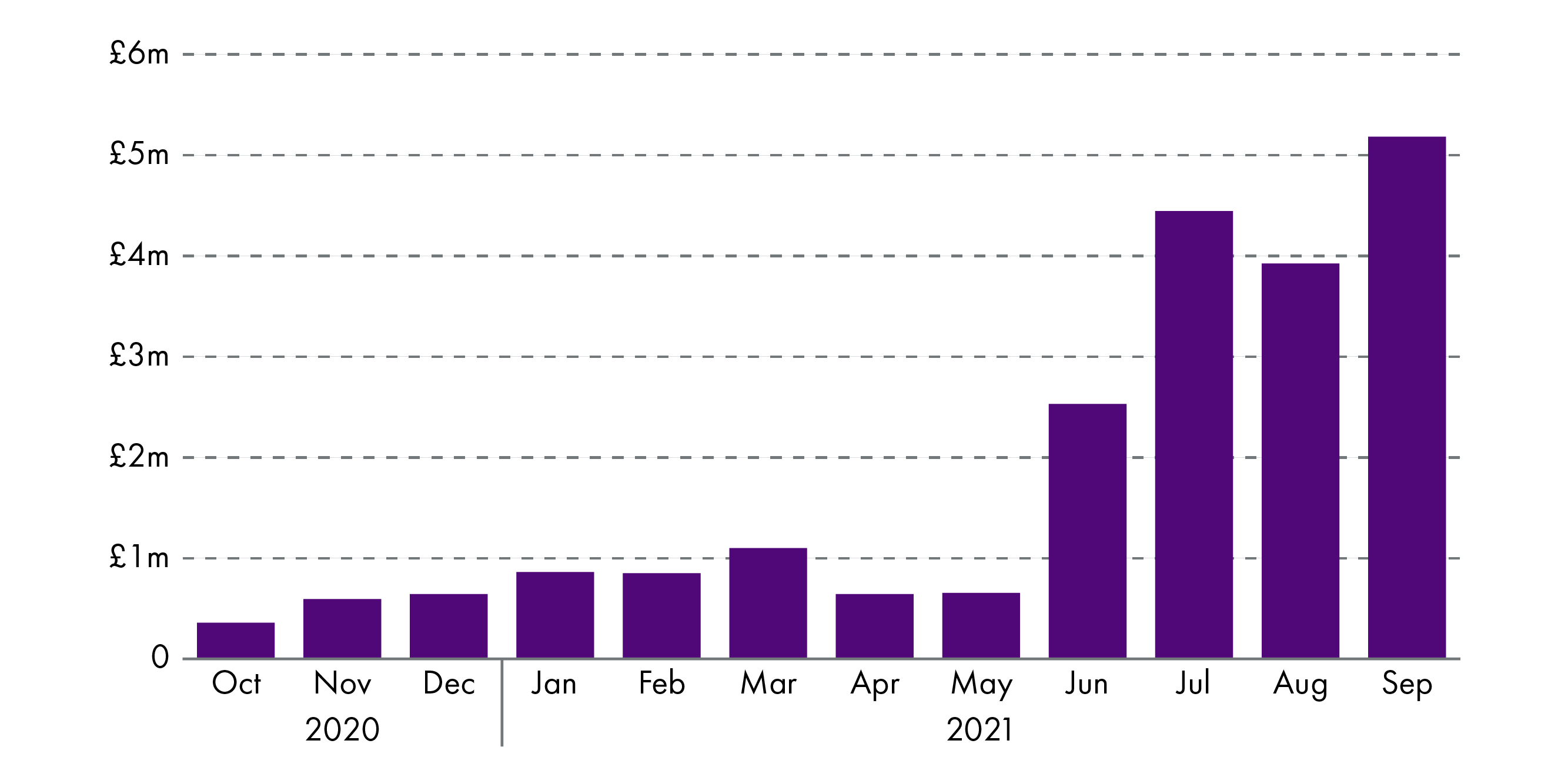 1. As set out in the SPICe briefing, the Scottish Government spent between £0.5 million and £1 million per month up to May 2021 on SISG awards. However by September 2021, payments were costing £5 million per month. In total, in the year to September 2021, the scheme has cost £21.7m, involving just over 43,000 payments, see fig 2.