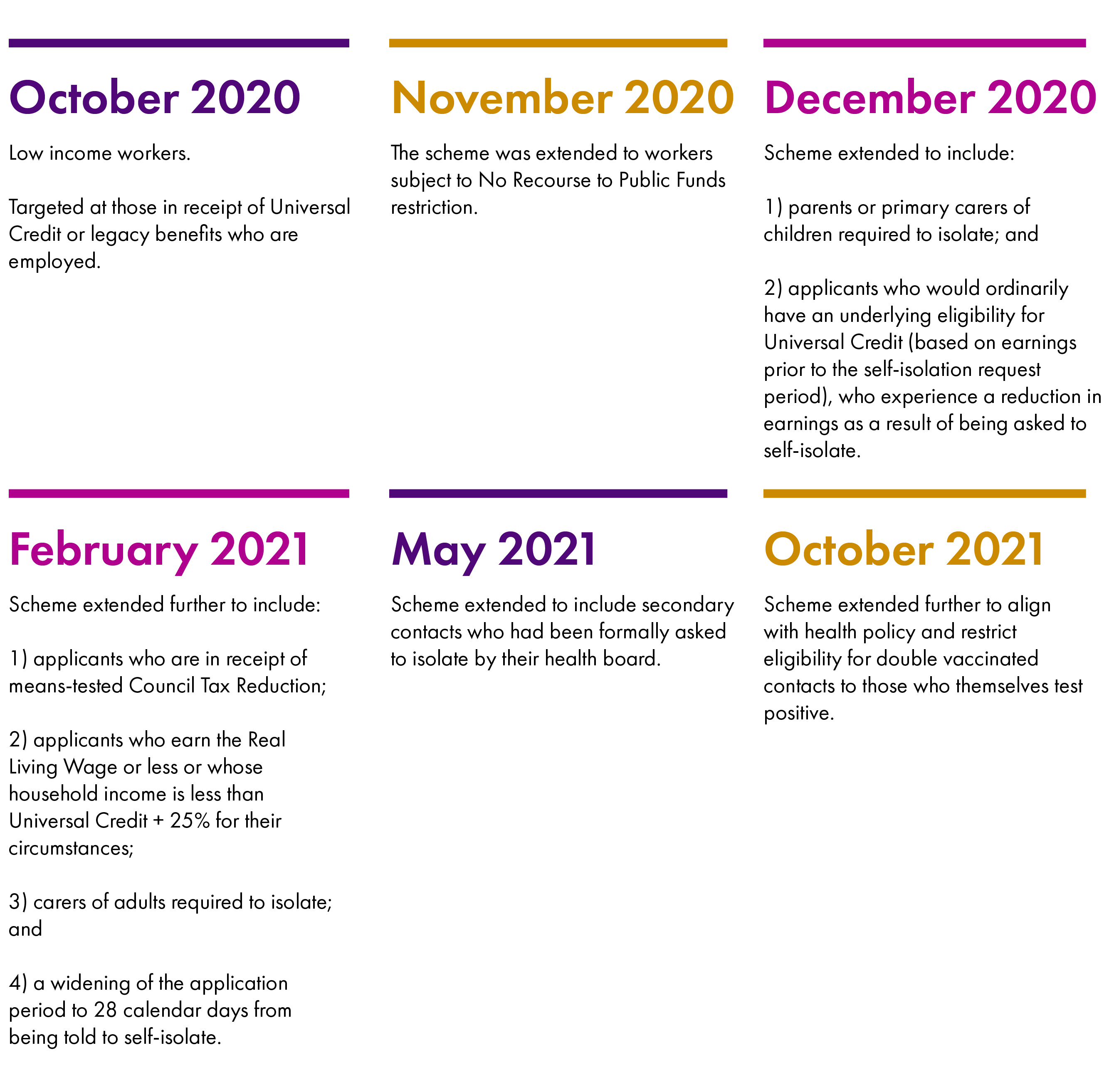 1. The Scottish Government announced the SISG on 28 September 2020 and opened for applications on 13 October 2020. The details of the scheme were expanded as the policy on self-isolation developed, see fig 1.