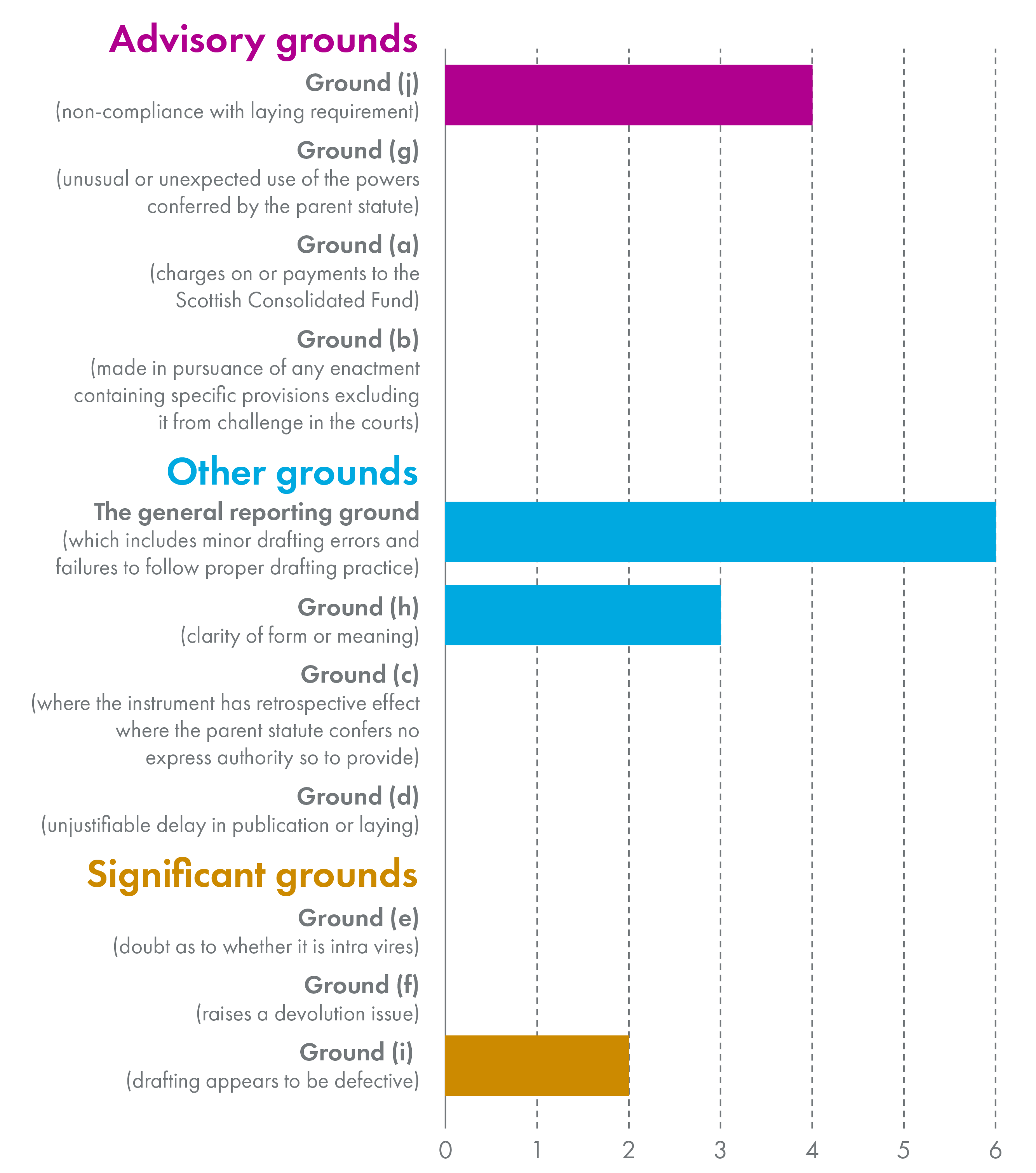 “Significant grounds” represent those areas which would cause the Committee most concern; “Other grounds” consist of areas where that concern would not be so significant, but nonetheless the matters can affect the understanding of an instrument if not its validity; “Advisory grounds” meanwhile relate to matters which the Committee wishes to draw to the attention of the Parliament or lead committee but do not affect the understanding of an instrument. The individual reporting grounds are broken down by their hierarchy below.