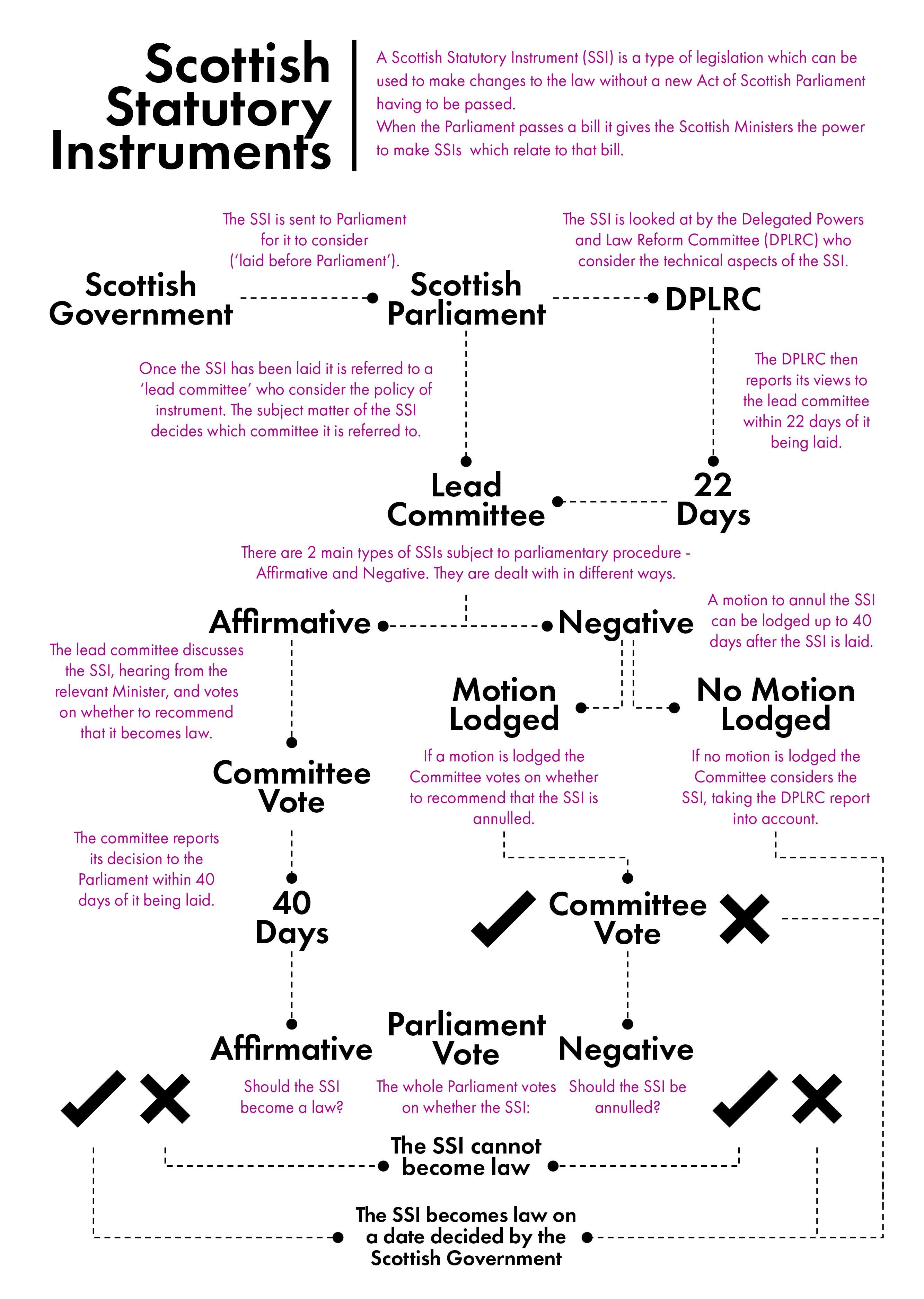 The DPLR Committee’s remit encompasses a number of different roles which are considered in this report. However, its primary focus is on the scrutiny of delegated powers in Scottish Parliament bills, UK Parliament bills (which delegate powers to make subordinate legislation within devolved competence) and subordinate legislation itself. Subordinate legislation in the Scottish Parliament comes primarily in the form of Scottish Statutory Instruments (SSIs).