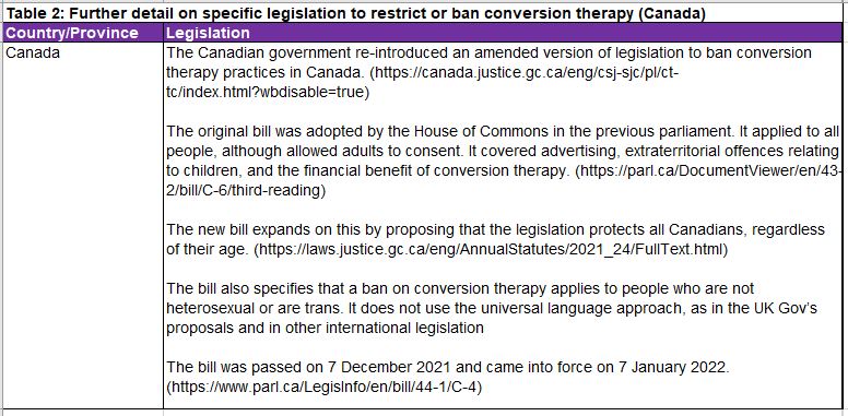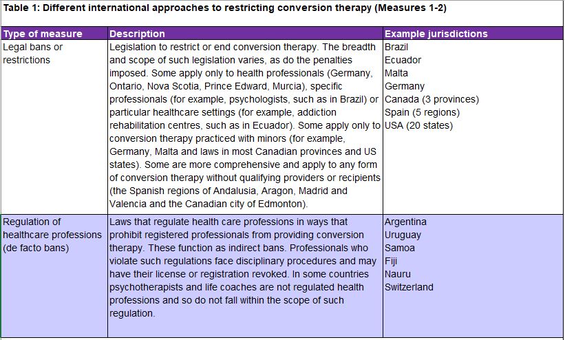 1. Tables 1iii and 2iv which set out different international approaches to restricting conversion practices and provide further details on specific legislation to restrict or ban conversion practices, can be found at Annexe B to this report.