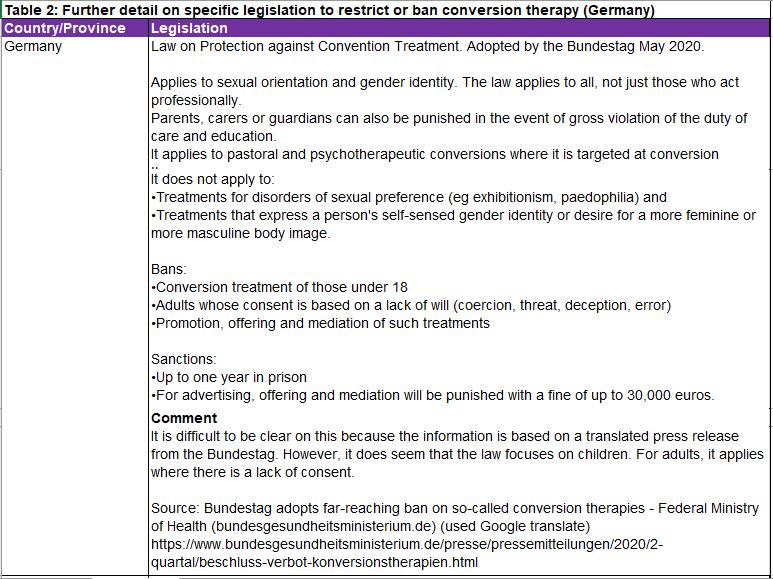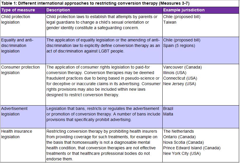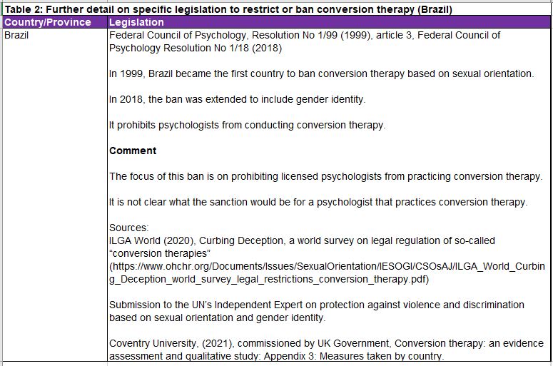 1. The Committee was interested to understand what interventions other countries around the world were using to ban or end conversion therapy. It discovered that there is a broad range and scope to international legislation and the penalties imposed on perpetrators.