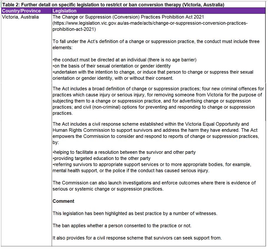 1. The Committee found it helpful to hear international approaches to restricting and banning conversion practices and heard evidence that the Victoria legislation in Australia provides one of the best practice examples.