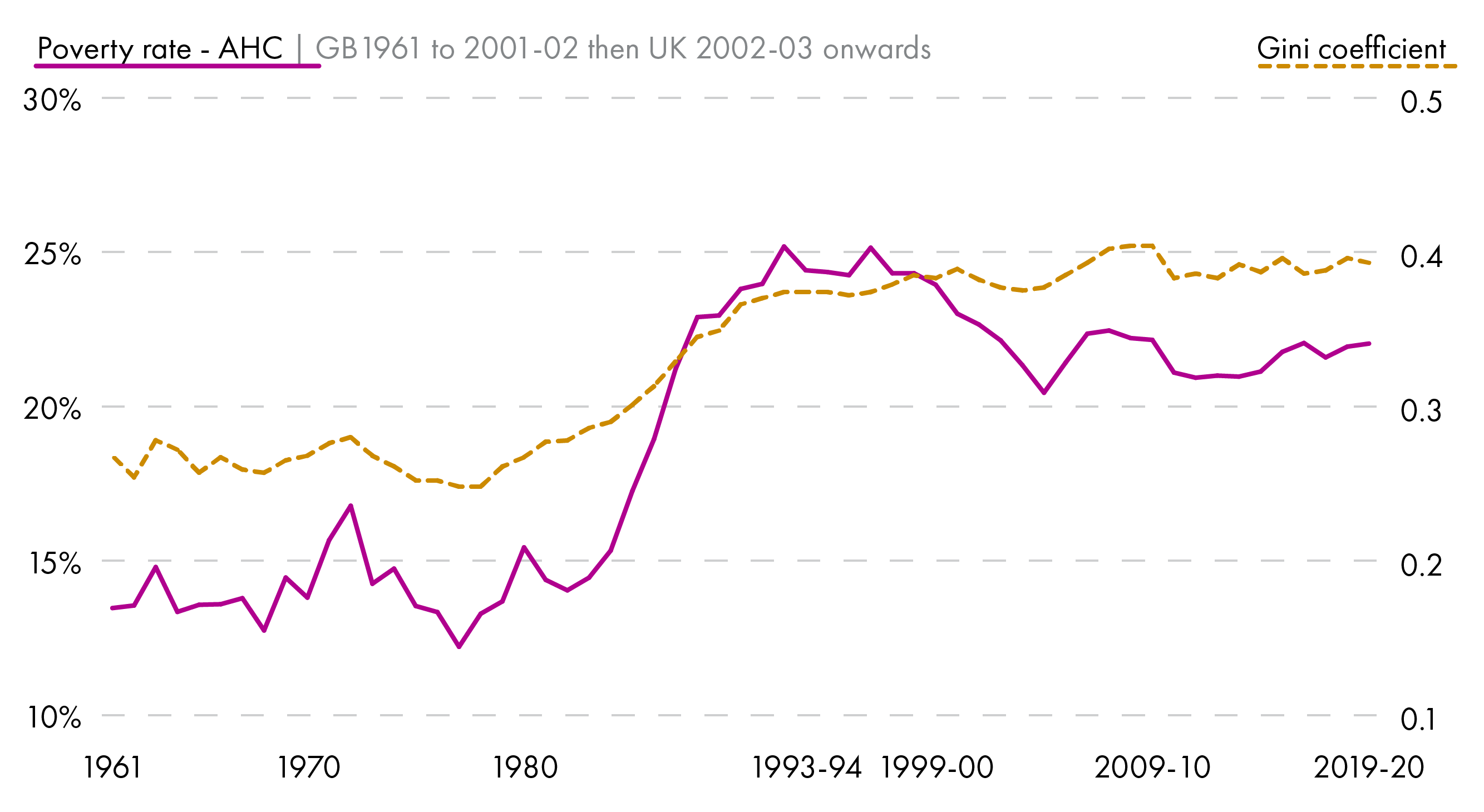 As Chart 4 highlights, median-related measures are intrinsically linked to levels of inequality in a society. The 1960s and 1970s had similar levels of income inequality; households generally saw their incomes grow. Levels of income inequality are significantly higher today than they were in 1961. This means it is challenging to show levels of child poverty in the UK in a consistent way in the 1960s and 1970s.