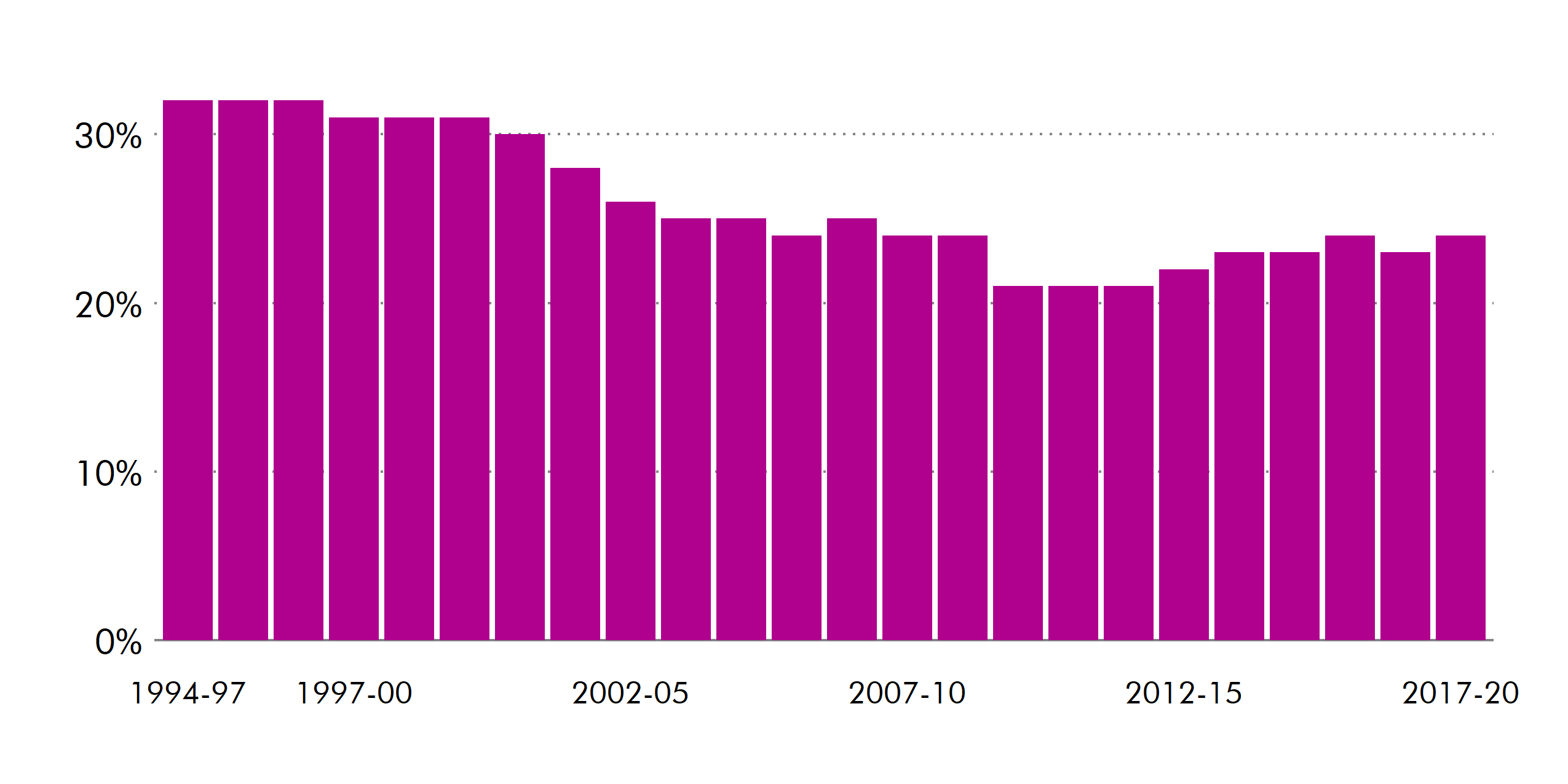 Between the mid 1990s and 2008 child poverty fell significantly across the UK, with Scotland witnessing some of the largest falls. Since 2015 Scotland has had a child poverty rate around six percentage points lower than the rest of the UK, but overall progress has stalled since 2004-05.