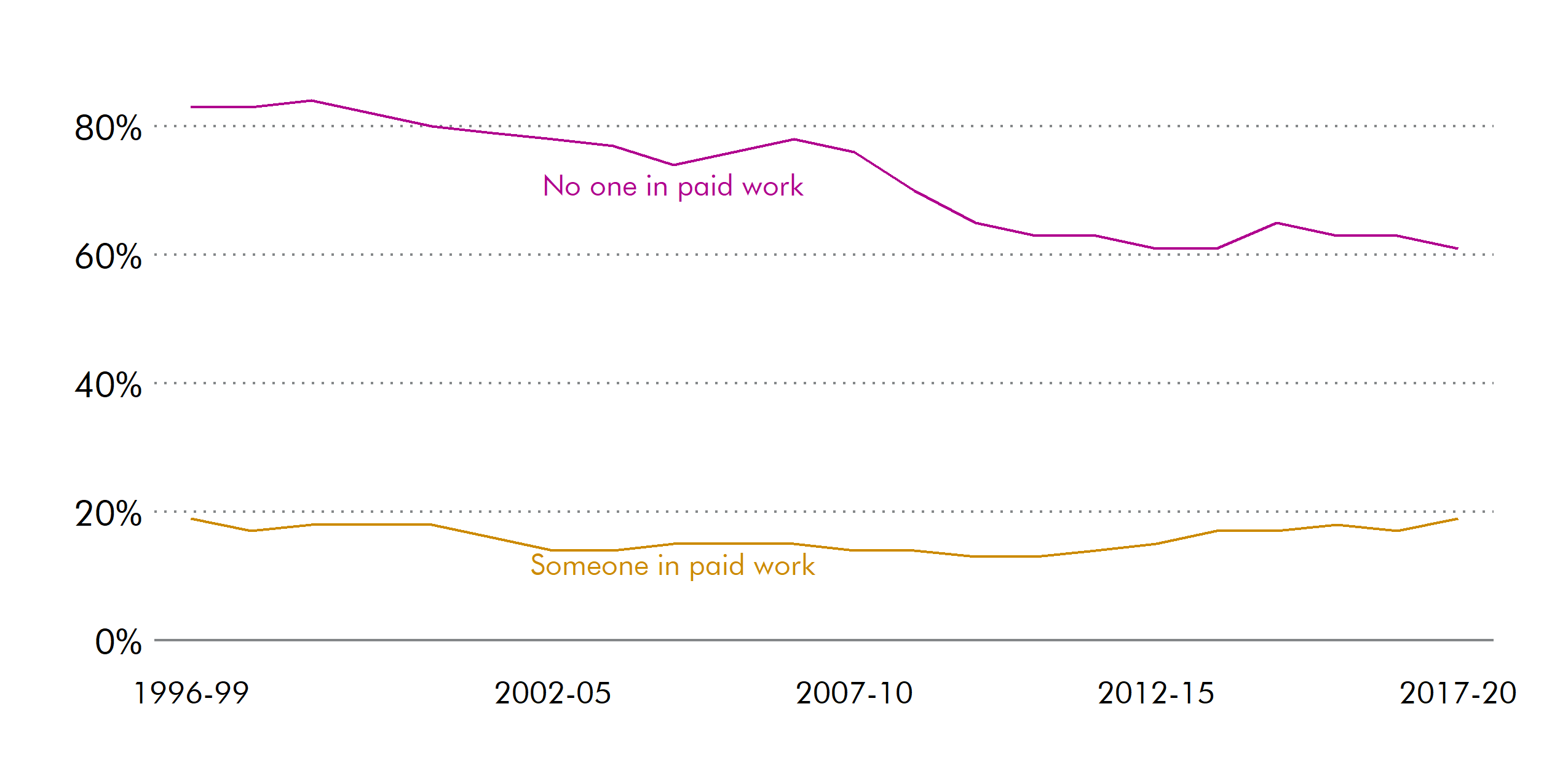 Chart 6 shows a decrease over the period in the proportion of children living in workless households who are in relative poverty. In 1996-99, 83% of children living in workless households were in relative poverty. This had reduced to 61% by 2017-20. On the other hand, the number of children in relative poverty living in households where at least one person is in work was the same in 2017-20 as it was in 1996-99.