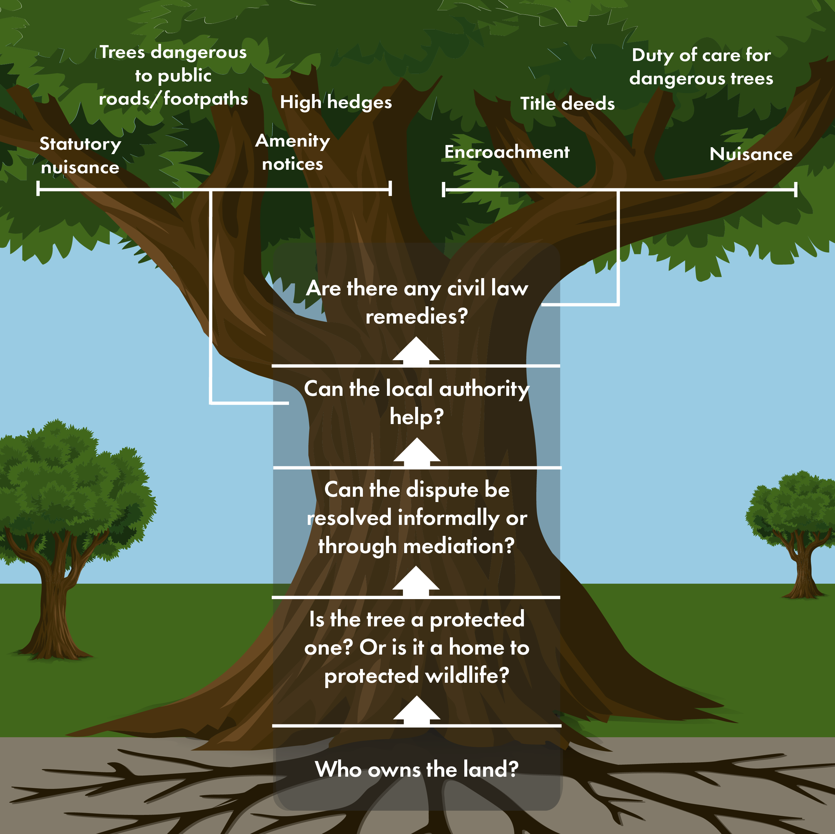 Broadly speaking, once ownership has been established, two areas of law are of importance to resolving neighbourhood disputes in relation to trees: